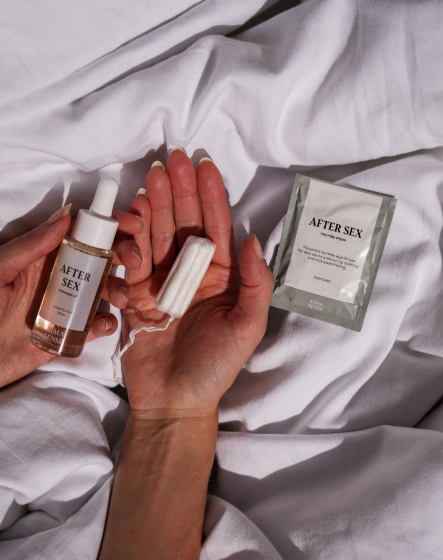 Step 2 - Clean with intimate wipes Use after sex or whenever you feel like it. The wipes are suitable as intimate cleaning for everyone, at any time.